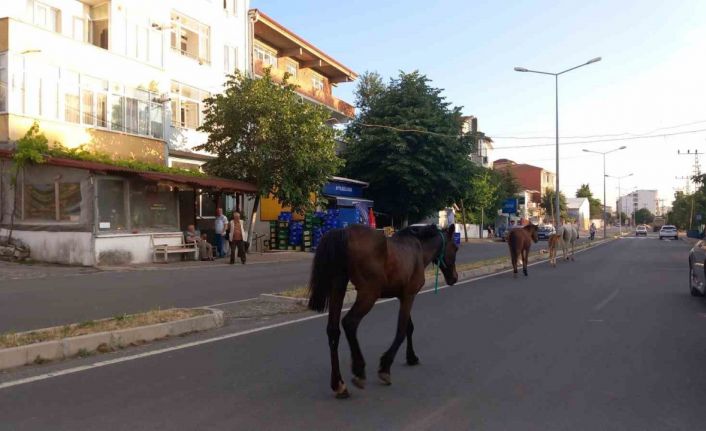 Kırklareli’nde sahipsiz başıboş atlar trafikte sürücülere zor anlar yaşatıyor.