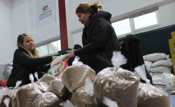 Depremzedelere yardım toplama merkezi olarak oluşturulan Gençlik Merkezinde bu gün hayırseverler tarafından bağışlanan 5 ton mercimek, 5 ton pirinç, 5 ton nohut, 5 ton bulgur ve 3 bin şişe yağ gönderilmek üzere paketleniyor.