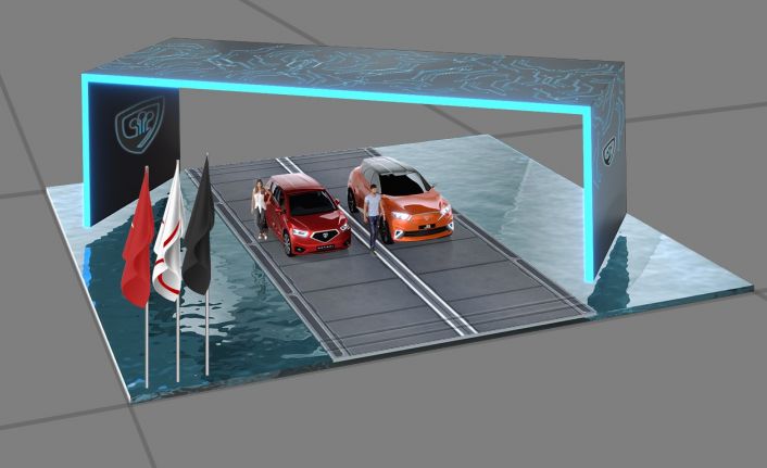 GÜNSEL Showroom’unda, mavi ve turkuaz tonların Akdeniz’i; B9 ve J9’un üzerinde yer aldığı platform ise Kıbrıs adasını simgeliyor. Köprü şeklinde tasarlanan platform üzerindeki devre izleri ise GÜNSEL’in elektrikli otomobiller üreteceğini ve KKTC’de doğan markanın dünya ile kurduğu bağları sembolize ediyor.