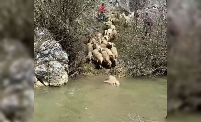 Koyunlar hastalıklara karşı derede yıkanıyor