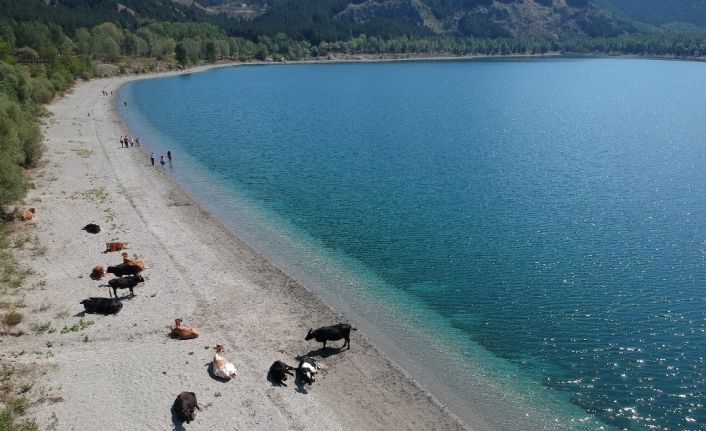 Isparta’da doğa harikası Gölcük Tabiat Parkı’nda hafta sonunda krater gölüne gelen ziyaretçiler, kıyıdaki inekleri görünce şaşkına döndü. İnekler kimini şaşırttı, kimini ise korkuttu.
