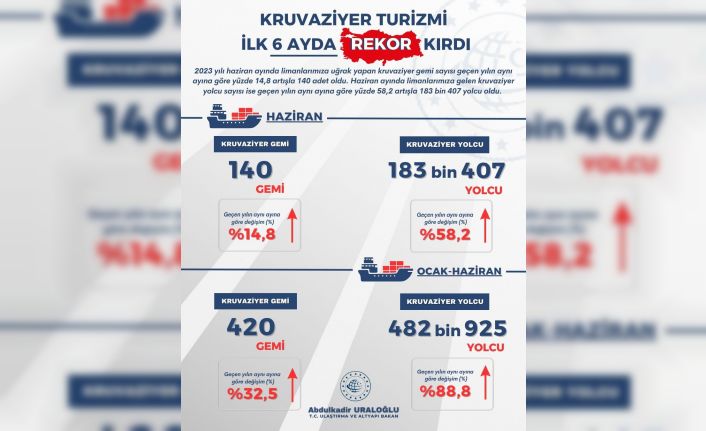 Ulaştırma ve Altyapı Bakanı Uraloğlu, 2023 yılı Ocak-Haziran döneminde limanlarımıza uğrak yapan kruvaziyer gemi sayısının geçen yılın aynı dönemine göre yüzde 32,5 artışla 420 adet, yolcu sayısı da geçen yılın aynı dönemine göre yüzde 88,8 artışla 482 bin 925 olduğunu bildirdi.