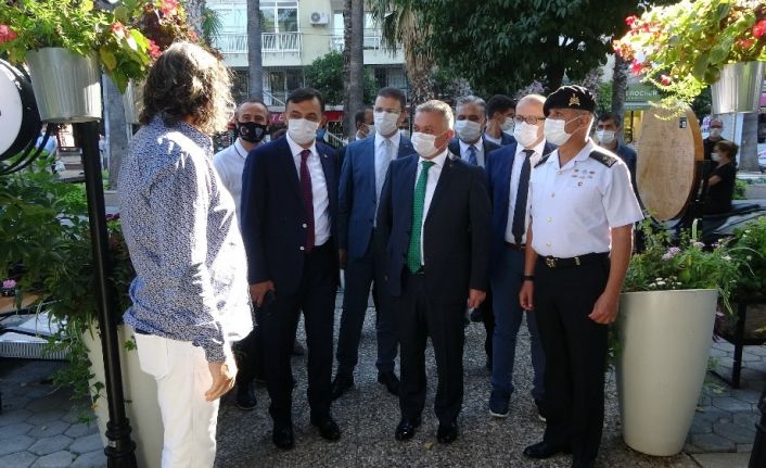 Antalya Valisi Ersin Yazıcı, vatandaşların yoğun olarak bulunduğu Işıklar Caddesi’nde korona virüse yönelik alınan tedbirlere uyulup uyulmadığını denetledi. Vali Yazıcı’ya İl Emniyet Müdürü Mehmet Murat Ulucan, İl Sağlık Müdürü Dr. Ünal Hülür, Muratpaşa Belediye Başkanı Ümit Uysal, Muratpaşa Kaymakamı Orhan Burhan da eşlik etti. Heyet, cadde üzerinde bulunan mağaza ve dükkanları gezerek denetimlerini sürdürdü. Esnafa kolaylıklar dileyen Yazıcı, önlemlere uyulup uyulmadığını sordu.