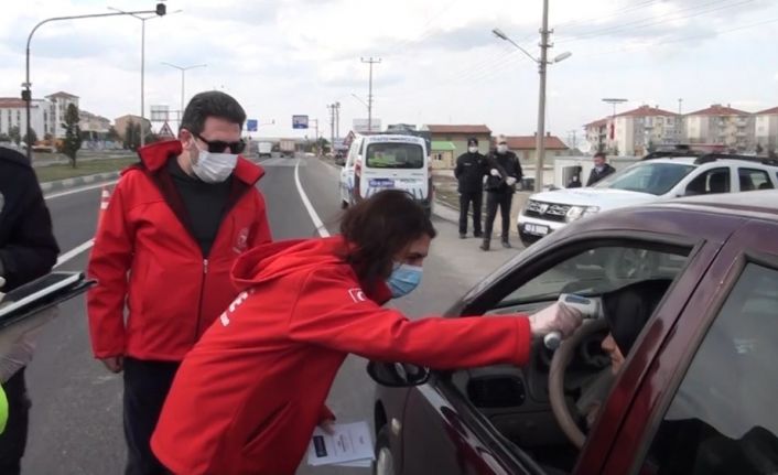 Polis ekiplerince durdurulan araç sürücülerine, Sağlık Müdürlüğü UMKE görevlilerince ateş kontrolü yapıldıktan sonra iller arası seyahat edip etmedikleri ve kentte kalıp kalmayacakları soruluyor.
