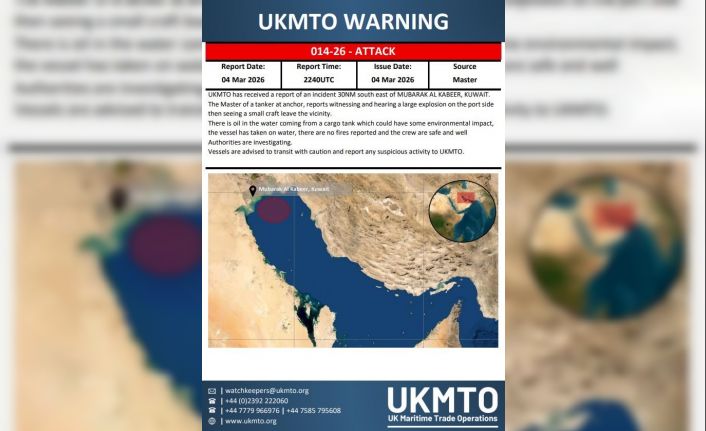 İran’ın ABD üslerine ev sahipliği yapan Körfez ülkelerine yönelik misilleme saldırıları sürerken, Kuveyt’ten şüpheli bir patlama haberi geldi. Birleşik Krallık Deniz Ticaret Operasyonları’ndan (UKMTO) yapılan açıklamada, Kuveyt’in Mubarak Al Kabeer limanının 30 deniz mili güneydoğusunda demirli bulunan bir petrol tankerinde patlama meydana geldiği bildirildi. Gemi kaptanının liman tarafında büyük bir patlama yaşandığını ve ardından küçük bir teknenin bölgeden ayrıldığını gördüğü aktarıldı. Patlamanın ardından tankerden denize petrol sızdığı belirtilen açıklamada, "Bu durum çevresel etkilere yol açabilir" ifadeleri kullanıldı. Ayrıca geminin su aldığı aktarılarak, "Ancak herhangi bir yangın bildirilmemiştir ve mürettebat güvendedir. Olayla ilgili soruşturma sürmektedir. Gemilerin dikkatli seyretmeleri ve şüpheli herhangi bir durumu UKMTO’ya bildirmeleri tavsiye edilmektedir" denildi.