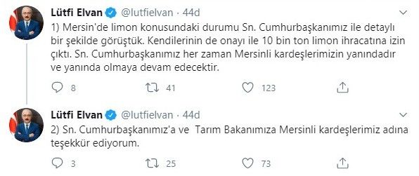 Elvan, konuya ilişkin sosyal medya hesabından yaptığı açıklamada, "Mersin’de limon konusundaki durumu Cumhurbaşkanımız ile detaylı bir şekilde görüştük. Kendilerinin de onayı ile 10 bin ton limon ihracatına izin çıktı. Cumhurbaşkanımız her zaman Mersinli kardeşlerimizin yanındadır ve yanında olmaya devam edecektir" dedi.