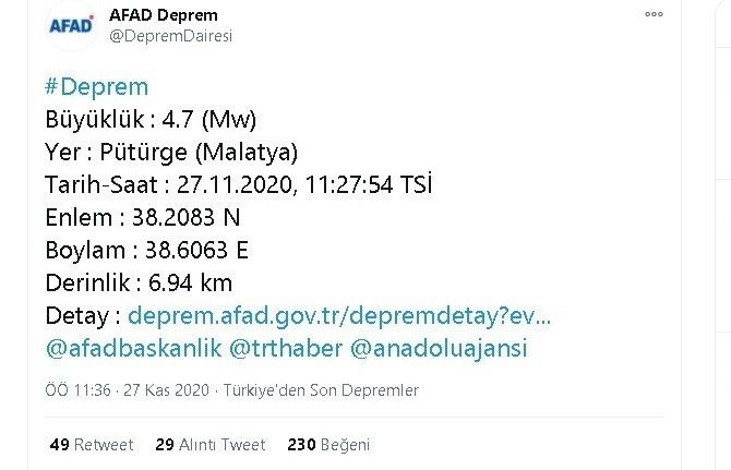 AFAD sosyal medya hesabından, "Büyüklük 4.7, Pütürge Malatya, 11:27" açıklamasında bulunuldu. Vatandaşlar kendilerini sokaklara atarken, deprem çevre illerden de hissedildi. Deprem anında kendilerini sokağa attıklarını ifade eden vatandaşlar, korkmadıklarını, bu duruma alıştıklarını söyledi.Malatya 4.7 ile sallandı