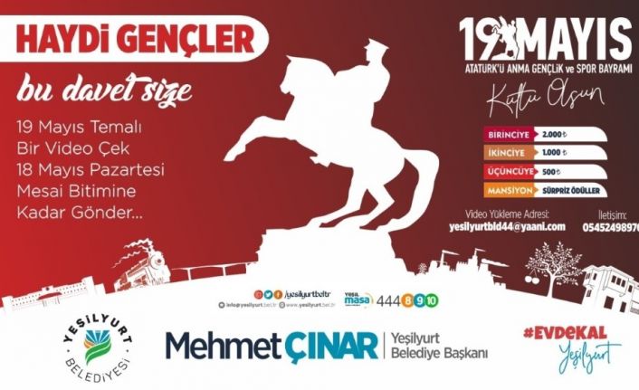 Malatya’nın Yeşilyurt Belediyesi, 19 Mayıs Atatürk’ü Anma, Gençlik ve Spor Bayramı nedeniyle, korona virüs salgını tedbirleri kapsamında vakitlerini evde geçiren gençlere yönelik ‘Haydi Gençler Bu Davet Size, 19 Mayıs Temalı Videonu Çek, Bize Gönder’ yarışması düzenleyecek. Yarışmada dereceye girecek olan gençlere para ödülünün yanı sıra sürpriz hediyeler gönderilecek.