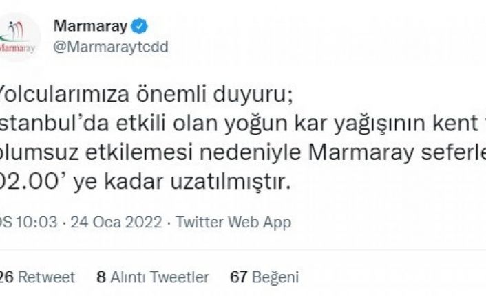 Ulaştırma ve Altyapı Bakanlığı TCDD Taşımacılık Genel Müdürlüğü’nün sosyal medya hesabında yapılan yazılı açıklamada, “İstanbul’da etkili olan yoğun kar yağışının kent trafiğini olumsuz etkilemesi nedeniyle Marmaray seferleri saat 02.00’ye kadar uzatılmıştır” denildi.