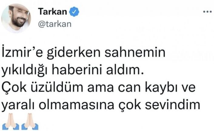 Yaşanan olayın ardından sosyal medya hesabından bir paylaşım yapan ünlü sanatçı Tarkan, “İzmir’e giderken sahnemin yıkıldığı haberini aldım. Çok üzüldüm ama can kaybı ve yaralı olmamasına çok sevindim. Emek veren herkesin ve ekip arkadaşlarımın iyi olduğunu bilmek beni çok mutlu etti. Herkese çok geçmiş olsun. Bu arada ben yoldayım. İzmir’e gidiyorum. Bu konserin gerçekleşmesi için elimizden ne gelirse yapacağız” ifadelerine yer verdi.