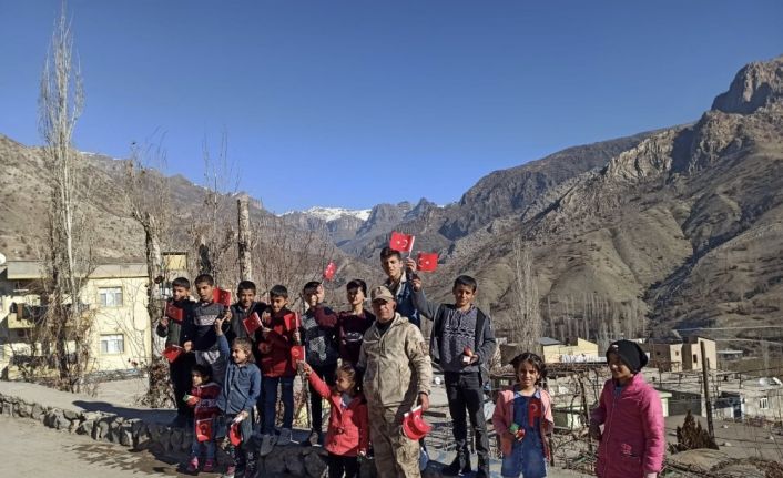 Şırnak’ın Uludere ilçesine bağlı Şenoba ve Hilal Jandarma Karakol Komutanlığı ekipleri, çocuklara Türk bayrağı, kek ve meyve suyu dağıttı.