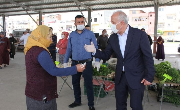 Pazar girişinde ve içinde zabıta ekipleri de Başkan Gültak ile birlikte vatandaşlara maske, dezenfektan ve eldiven dağıttı.