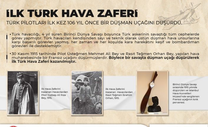 30 Kasım 1915 yılında Birinci Dünya Savaşı sırasında gerçekleşen hava muharebesinde bir Fransız savaş uçağı düşürülmüştü. Çanakkale Cephesi’nde görev yapmakta olan Pilot Üsteğmen Mehmet Ali Bey ve Rasıt Teğmen Orhan Bey tarafından icra edilen operasyonla düşürülen uçak ile ilk Türk hava zaferi de kazanılmış oldu. Milli Savunma Bakanlığının sosyal medya hesabından ilk Türk hava zaferi anısına yapılan paylaşımda, "Kahraman Türk pilotları 106 yıl önce Çanakkale Cephesi’ndeki hava muharebesinde bir Fransız uçağını düşürdü. Böylece bir savaşta düşman uçağı düşürülerek ilk Türk hava zaferi kazanıldı. Tüm kahramanlarımızı rahmetle ve saygıyla anıyoruz" denildi.