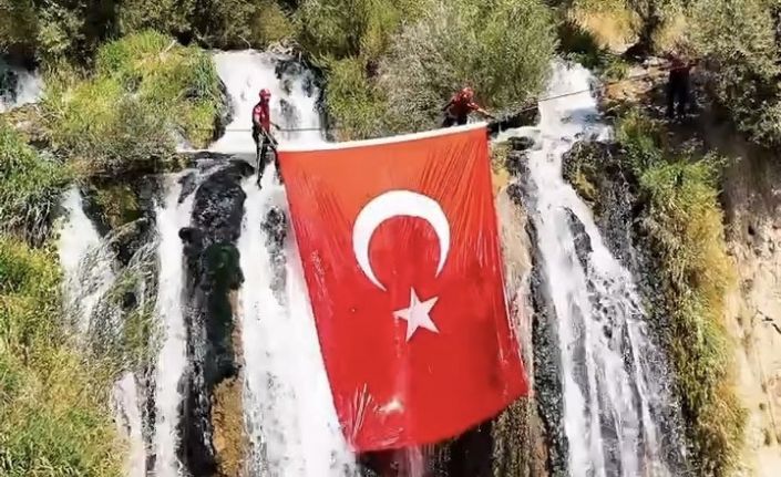 Van İl Jandarma Komutanlığı emrinde görev yapan Jandarma Arama Kurtarma (JAK) timleri, 30 Ağustos Zafer Bayramı etkinlikleri kapsamında Muradiye Şelalesi’nde dev Türk bayrağı açtı.