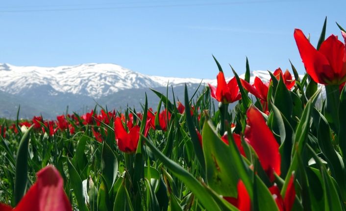 Muş Ovası’nda doğal olarak yetişen ve endemik bitki türleri arasında yer alan Muş Lalesi’nin karlı dağlarla birleşen görüntüleri kartpostallık oluşturuyor.