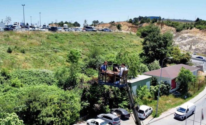 Arnavutköy Merkez Mahallesi’nde bulunan butik kafeye gelen 2 kişi, işletme sahibiyle şakalaşarak teras manzarası sordu. İşletme sahibinin şaka yapmak maksadıyla sorduğu ‘Vinç çağırayım mı?’ sorusuna ’Evet’ yanıtı veren müşteriler için vinç çağrıldı. Vinçle 40 metre yüksekliğe çıkartılan 2 kişi, çay içerek tavla oynadı. O anlar dron kamerasıyla görüntülenirken, yapılan şakanın gerçek olması herkesi hayrete düşürdü. 40 metre yükseklikte orman manzarasında çay içerek tavla oynayan kişileri görenler de merakla izledi.