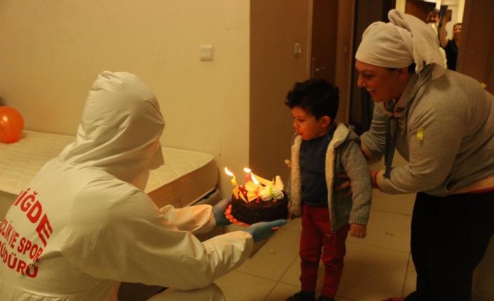 Özel kıyafet giyen Gençlik ve Spor İl Müdürü İlker Ötgünlü, Mehmet Güven’in kaldığı odaya pasta götürdü. Kendisi için hazırlanan doğum günü pastasındaki mumları üfleyen Mehmet Güven’e Niğde Gençlik ve Spor İl Müdürü Ötgünlü oyuncak araba da hediye etti. Karantinanın kendi ve ailelerinin sağlığı için çok yerinde bir karar olduğunu söyleyen anne Yeliz Duman çocuğunun doğum gününü kutlayamadığı için çok üzüldüğünü söyleyerek kutlamada emeği geçenlere teşekkür etti.