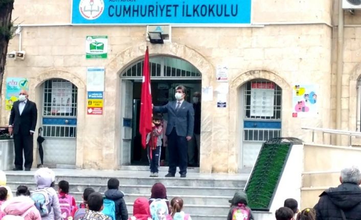 Adıyaman Cumhuriyet İlkokulunda bu hafta sonu okunan İstiklal Marşı töreninde gururlandıran görüntüler ortaya çıktı. Okulların ara tatile girmesi ve hafta sonu olması nedeniyle okul bahçesinde düzenlenen İstiklal Marşı töreninde 1. Sınıf öğrencisi Oğuzhan Güzel, ahşap direkteki Türk Bayrağını kendisi tutmak istedi.