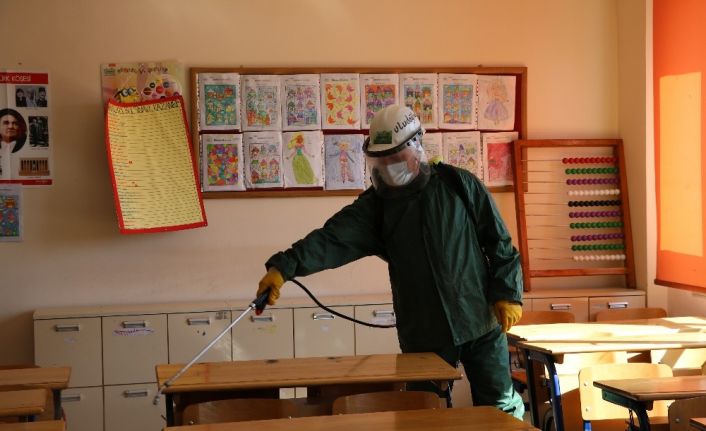 İlaçlama işlemini yapan Mustafa Uludağ ise, “Sodyum klorür denilen bir ilaç ile okulumuzu ilaçlıyoruz. Sınıflarda ve koridorlarda çocukların elinin değeceği her yeri dezenfekte ediyoruz. Ben bu işi ücretsiz olarak iki okula yapacağım. İşimiz bittikten sonra ozon cihazı sayesinde okulun havasını da değiştirerek dezenfekte işlemini tamamlıyoruz” diye konuştu.
