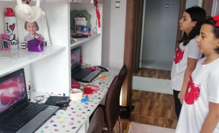 Korona virüs salgını sebebiyle uzun zamandır okullarından uzak kalan ikiz kardeşler Ceren ve Ceylin Özkan, Türk Bayraklı tişörtlerini giyerek, törene evlerinden eşlik etti. İki kardeş bilgisayar başında katıldıkları bayrak töreninde birlikte İstiklal Marşı’nı okudu.