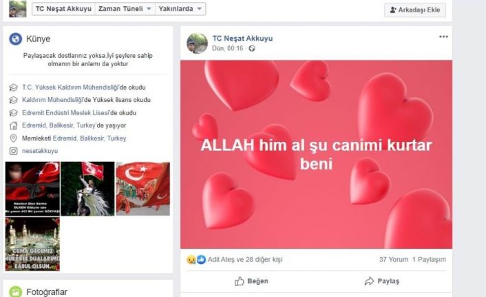 2 çocuk babası olan ve rahatsızlanmadan önce oto yıkamacılığı yapan 41 yaşındaki Neşat Akkuyu, gece yarısından sonra sosyal medya hesabından, ‘Allah’ım al şu canımı, kurtar beni’ şeklinde bir paylaşımda bulundu. Akkuyu, çok geçmeden vefat etti. Neşat Akkuyu, dün öğle namazını müteakip Darsofa Camii’nde kılınan cenaze namazının ardından toprağa verildi.