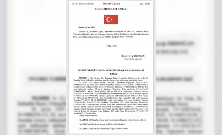 Giresun’un Bulancak ilçesi Aydındere Belediyesi ile Ordu’nun Kabadüz ilçesi Yokuşdibi Mahallesi arasındaki il sınırı yeniden belirlendi.