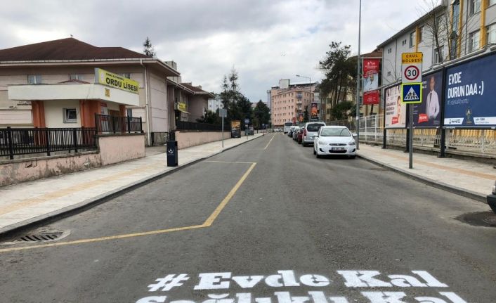 Ordu’da Altınordu Belediyesi hem Korona virüs salgını dolayısıyla yapılan evde kal çağrılarına destek vermek hem de vatandaşların çağrılara uymasını sağlamak amacıyla şehrin sokaklarını ‘Evde Kal Sağlıklı Kal’ yazılı yer yazıları ile donattı.