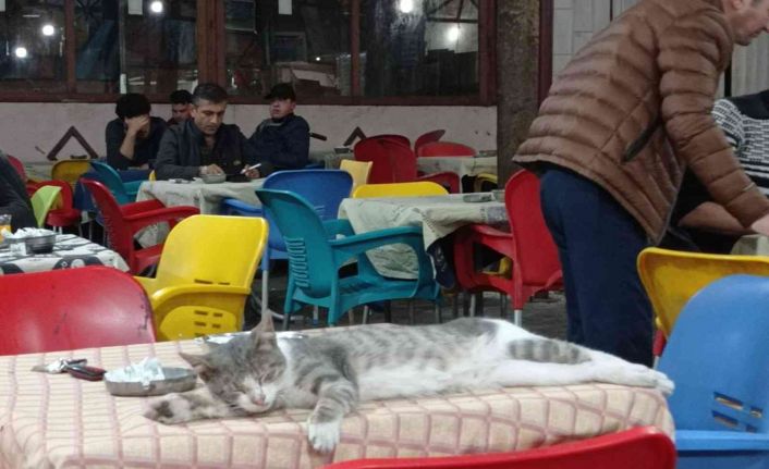 Bilecik’te soğuktan üşüyen ve kafeteryaya sığınarak sıcaktan bir masanın üzerinde uyuya kalan kediyi kimse rahatsız etmedi. Hatta o masaya hiç kimse oturmadı.