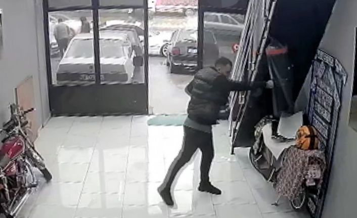 Galerici Uğur Gönül, hızını alamayarak boks torbasına yaklaşık 15-16 yumruk salladı. Darbelere dayanamayan boks torbası bir anda patlarken, parçaları ise etrafa saçıldı. Bu anlar ise iş yerinin güvenlik kamerasınca saniye saniye kaydedildi.