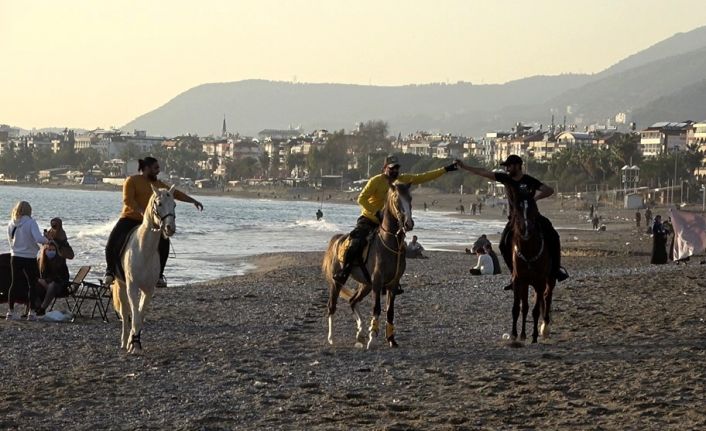 Her yıl yüz binlerce yerli ve yabancı turisti ağırlayan Antalya’nın Alanya ilçesindeki sahiller renkli görüntülere sahne oldu. Güneşli havayı fırsat binerek sahile gelen 3 kişi at binmenin keyfini yaşarken, çocuklar ise fotoğraf çekinmek için sıraya girdi.