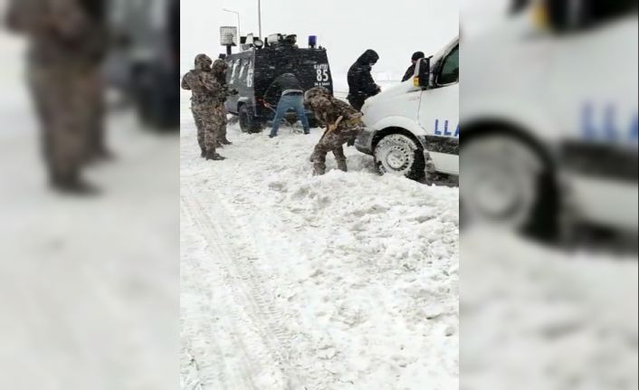 İstanbul Havalimanı’na işçi taşıyan servis, Arnavutköy Tayakadın Mahallesi’nde yoğun kar nedeniyle yolda kaldı. Yolcuları ile birlikte yolda kalan servis aracına bölgede devriye gezen Özel Harekat polisleri yardım etti. Ellerine kürekleri alan polisler, önce servis aracının önünü açtı, daha sonra iple aracı sıkıştığı yerden çıkarttı. O anlar ise cep telefonu kamerası ile anbean kaydedildi.(Özel) Arnavutköy’de yolda kalan servisin yardımına polis koştu