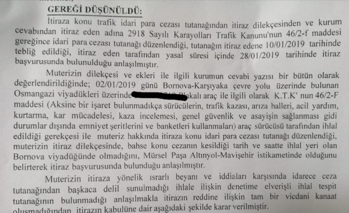 Birçok sürücüyü ilgilendiren karar, İzmir 6. Sulh Ceza Hakimliğinde görülen davada verildi. Edinilen bilgiye göre, bir araç sürücüsüne 10 Ocak 2019 tarihinde aksi bir durum olmadığı halde emniyet şeridini kullandığı gerekçesiyle bin liralık trafik cezası geldi. Tebliğ edilen ceza tutanağına baktığında, evrakta yazan 2 Ocak 2019’da Bornova-Karşıyaka çevre yolundaki Osmangazi viyadüklerinde değil Mürsel Paşa-Altınyol Mavişehir istikametinde olduğunu hatırlayan şahıs, cezaya itiraz etti. Söz konusu tarih ve saatte o bölgede bulunmadığına ilişkin delilleri mahkemeye sunan araç sürücüsü, mahkemenin verdiği emsal kararla cezayı ödemekten kurtuldu. Avukat Ali Onar, “Özellikle trafik cezalarında olduğu gibi evrak üzerinde giden dosyalarda fazla emsal karar çıkmıyor. Bu çok dikkat çekici bir karar. Çünkü evrak üzerinde usul ve şartlar yerine geldi mi, gelmedi mi şeklinde değerlendirmeler yapılıyor. Ancak bu davada mahkeme, yargılamayı derinleştirerek ve cezanın gerçekten var olup olmadığını araştırmak suretiyle bu kararı verdi. Vatandaşlarımız eğer haklı olduklarına inanıyorlarsa süresi içerisinde delillerle birlikte haklarını savunsunlar ve ısrar etsinler” diye konuştu.
