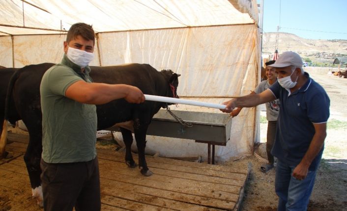 Kayseri’de hayvan pazarlarında besiciler tarafından korona virüs tedbirleri kapsamında sosyal mesafe kurallarına uymak amacıyla kullanılan boru ile çetin pazarlıklar yapılıyor.