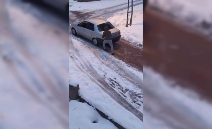 İstanbul’da günlerdir etkisini sürdüren kar yağışı aralıksız bir şekilde devam ediyor. Kar yağışı ile birlikte bazı noktalarda buzlanmalarda meydana geldi. Kar yağışı sonrası tarife çıkan araç sürücüleriyse zor anlar yaşadı. Aracıyla evinden işe gitmek üzere yola çıkan bir sürücü kar ve buzlanma nedeniyle hareket edemedi. Durumu gören çevredeki bir vatandaş ise mahsur kalan aracı iterek olduğu yerden çıkarmaya çalıştı. Vatandaşın aracı kurtarma çabası ise cep telefonu kamerasına yansıdı.(Özel) Mahsur kalan aracı kurtarmak isteyen vatandaşın çabası kamerada