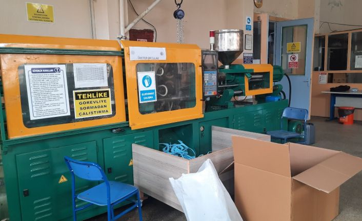 Pandeminin başından bu yana gönüllü olarak siperlik üretim faaliyetine katıldığını söyleyen okul öğrencisi Umut Can Alpı, “Son sınıftayım ve makine bölümündeyim. Makine atölyesinde pandemi süresince 1 yılı aşkın bir zamandır siperlik üretmekteyiz. Bu siperlikleri atık maddelerden yani atık plastiklerden yapmaktayız. Atık plastikleri farklı aşamalardan geçirip siperlik, mama kabı ve silgi üretmekteyiz” diye konuştu.