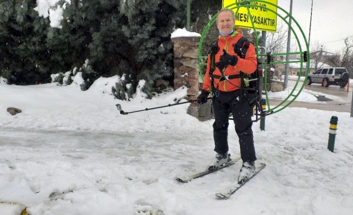 Bursa’da paramotorla sokakta karların üzerinde kayak yapan İbrahim Dinçer, her yere paramotoruyla kayarak gidiyor.