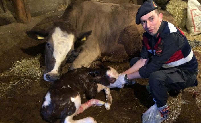 (Özel) Yaşlı kadının ineğinin doğumunu jandarma yaptırdı