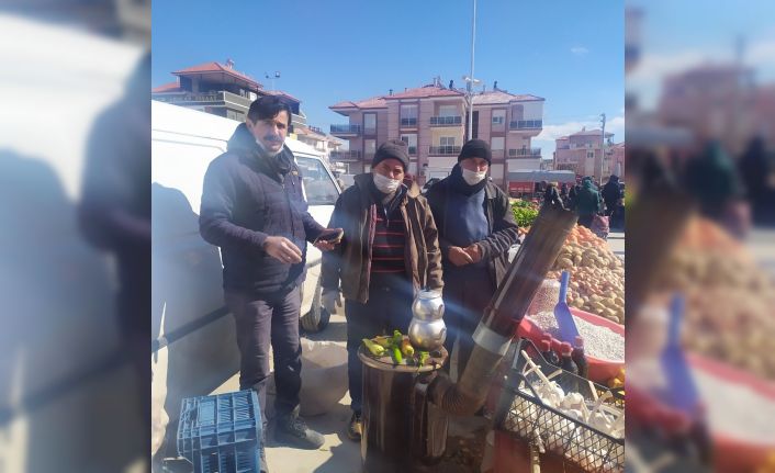 Antalya’nın Korkuteli ilçesinde soğuk hava nedeniyle pazarcı esnafı tezgahlarının yanında ısınmak için soba kurdu. Kimi esnaf teneke kutusu içerisinde tahta parçası yakarak ısınmaya çalışırken kimi esnaf ise kurduğu odun sobasının yanında hem satış yapıp hem de ısındı.