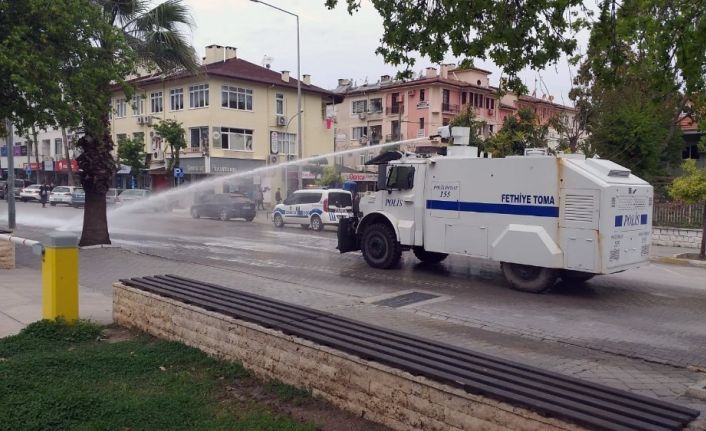 Muğla’nın Fethiye ilçesinde, korona virüs önlemleri kapsamında pazar yerlerinde yapılan dezenfekte çalışması TOMA tarafından gerçekleştirildi.