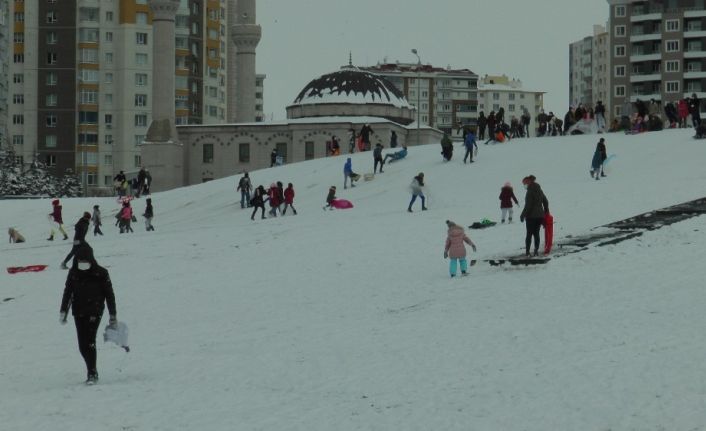 Kayseri’de yağan karın tadını çıkarmak isteyen vatandaşlar leğen, tepsi ve poşetlerini alarak ‘Beleştepe’ye koştu.