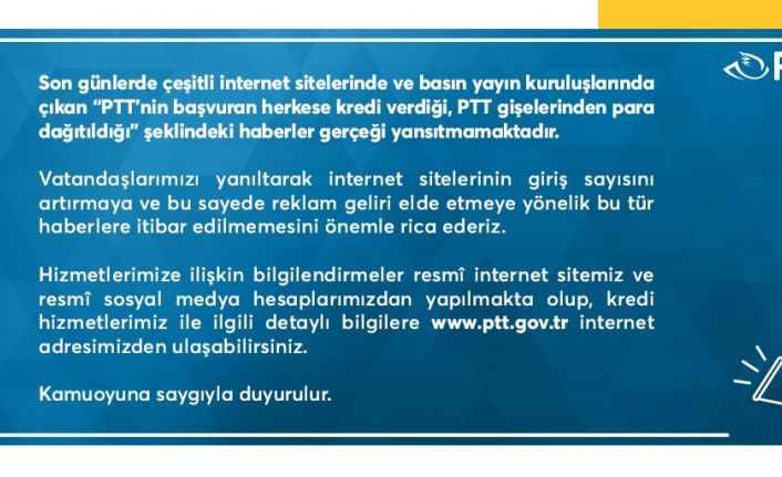 PTT’den yapılan açıklamada, "Son günlerde çeşitli internet sitelerinde ve basın yayın kuruluşlarında çıkan ’PTT’nin başvuran herkese kredi verdiği, PTT gişelerinden para dağıtıldığı’ şeklindeki haberler gerçeği yansıtmamaktadır. Vatandaşlarımızı yanıltarak internet sitelerinin giriş sayısını artırmaya ve bu sayede reklam geliri elde etmeye yönelik bu tür haberlere itibar edilmemesini önemle rica ederiz. Hizmetlerimize ilişkin bilgilendirmeler resmi internet sitemiz ve resmi sosyal medya hesaplarımızdan yapılmakta olup, kredi hizmetlerimiz ile ilgili detaylı bilgilere www.ptt.gov.tr internet adresimizden ulaşabilirsiniz" denildi.