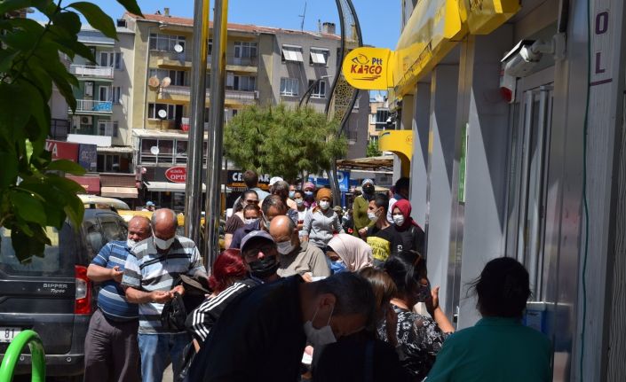 17 günlük sokağa çıkma kısıtlaması devam ederken, İzmir’in Aliağa ilçesinde işlem yaptırmak için PTT şubesine gidenler uzun kuyruklar oluşturdu, sosyal mesafe kuralları hiçe sayıldı.