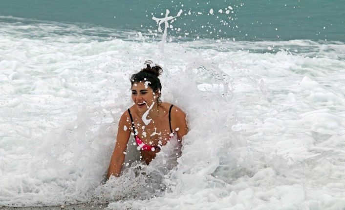 Antalya’da 2 gündür etkili olan sağanağın ardından bugün yağmur yağmayınca dünyaca ünlü sahile gelen Rus kadın, dev dalgaların oluşturduğu köpüklerin arasında denize girdi. Havanın soğukluğuna aldırış etmeyen Rus kadın, “Her gün denize giriyorum ama dün çok büyük dalgalar vardı giremedim. Burada yaşamayı çok seviyorum” dedi.