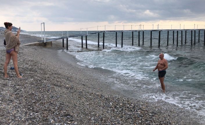 Rus turistler soğuk havaya aldırış etmeden denize girdi