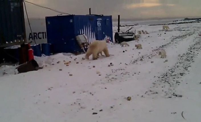 Rusya’ya bağlı Sibirya’nın kuzeyinde bulunan Yamal yarımadasında aç kalan kutup ayıları bir şantiyeye indi. İşçiler kutup ayılarını görünce büyük panik yaşarken, ayılar seyir halindeki şantiye kamyonunu çevreledi. Kamyonun sürücüsü şantiyeden uzaklaşarak kutup ayılarından kurtulmaya çalışsa da kutup ayılarından biri kamyonun kasasına asıldı, diğerleri ise kamyonu kovaladı. O anlar şantiyedeki işçiler tarafından saniye saniye kaydedildi.