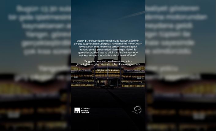 Bugün saat 13.30 sıralarında Sabiha Gökçen Havalimanı’nda bulunan bir gıda işletmesinin mutfağından yayılan duman hakkında Sabiha Gökçen Havalimanı İşletmesi ISG tarafından açıklama yapıldı. Açıklamada, “Bugün saat 13.30 sularında, İstanbul Sabiha Gökçen Havalimanı terminalimizde faaliyet gösteren bir gıda işletmesinin mutfağında, havalandırma motorundan kaynaklanan arıza nedeniyle yangın meydana geldi. Yangın, görevli personellerimizin yangın tüpleri ile gerçekleştirdikleri hızlı ve etkili müdahale sayesinde çok kısa sürede kontrol altına alındı ve söndürüldü. Yangından kaynaklı havalimanımızın yolcu giriş çıkışları ve çalışmalarında hiçbir aksama yaşanmadı" ifadelerine yer verildi.