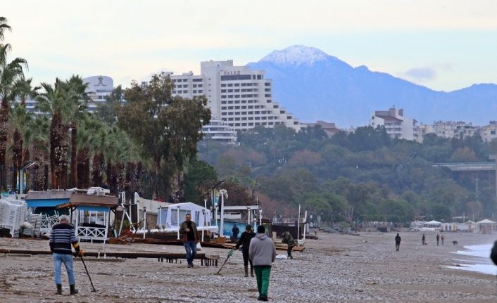 Antalya’da 3 gündür etkili olan sağanak yağış ve rüzgar nedeniyle denizde dev dalgalar meydana geldi. Yağışlı havanın bugün kenti terk etmesinin ardından ise dünyaca ünlü Konyaaltı Sahiline define avcıları akın etti. Ellerine dedektör alan çok sayıda kişi, her yaz binlerce turisti ağırlayan sahile gelerek altın ile değerli maden arayışına çıktı. Elektronik cihazın çıkardığı sesleri kulaklıkla dinleyerek sahil bandını tarayan define avcıları, sinyalin geldiği noktayı kazıp madeni paralara ulaştı. İşlerinin pandemiden dolayı kesat gittiğini belirten bir define avcısının ise tatilcilere çağrısı güldürdü.