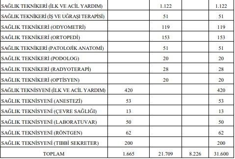 Resmi Gazete’de yayımlanan ilana göre, Sağlık Bakanlığı taşra teşkilatı hizmet birimlerinde istihdam edilmek üzere 31 bin 600 sözleşmeli sağlık personeli Kamu Personeli Seçme Sınavı (KPSS) sonucuna göre ÖSYM tarafından yapılacak merkezi yerleştirme ile alınacak. Ortaöğretim, ön lisans ve lisans düzeylerinde tercih yapılabilecek sözleşmeli personel pozisyonlarının ve başvuru şartlarının bulunduğu KPSS-2023/5 Tercih Kılavuzu, ÖSYM’nin internet sitesi üzerinden yayınlanacak. Adaylar tercihlerini 28 Mart 2023 - 03 Nisan 2023 tarihleri arasında tercih kılavuzunda belirtilen kurallara göre ÖSYM’nin internet sitesi üzerinden T.C. Kimlik Numarası ve şifresini girerek yapabilecek. ÖSYM’ye veya Sağlık Bakanlığına posta yoluyla gönderilen veya elden verilen tercih listeleri geçerli olmayacak. Sağlık Bakanlığı tarafından alınacak olan sözleşmeli personelin pozisyonlarının unvan/branş ve öğrenim düzeylerine göre dağılımı, "28 lisans mezunu biyolog, 102 lisans mezunu çocuk gelişimci, 100 lisans mezunu diğer sağlık personeli, 41 lisans mezunu dil ve konuşma terapisti, 255 lisans mezunu diyetisyen, bin 530 lisans mezunu ebe, 510 lisans mezunu fizyoterapist, 867 ortaöğretim ve 5 bin 202 lisans mezunu olmak üzere toplam 6 bin 69 hemşire, 28 lisans mezunu iş ve uğraşı terapisti (ergoterapist), 26 lisans mezunu odyolog, 25 lisans mezunu perfüzyonist, 255 lisans mezunu psikolog, 33 lisans mezunu sağlık fizikçisi, 91 lisans mezunu sosyal çalışmacı, 21 bin 709 ön lisans mezunu ve 798 ortaöğrenim mezunu çeşitli sağlık teknikeri" olarak belirtildi.