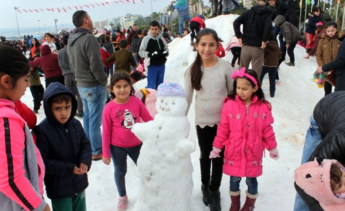 Erdemli Belediyesi tarafından bu yıl 2.’si düzenlenen kar festivali ilçe sahilinde Dr. Devlet Bahçeli Meydanı’nda yapıldı. Kamyonlarla taşınan tonlarca kar ile adeta karlı bir dağ kesiti oluşturuldu. Tonlarca karın üzerinde ise çocuklar gönüllerince eğlendi. Kardan yapılan yamaçta kayıp eğlenen çocukların mutluluğu yüzlerine yansıdı.
