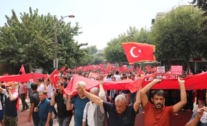 Vatandaşlar yürüyüş boyunca ellerindeki Türk bayraklarıyla terörü kınayan sloganlar attı. Yürüyüş sonunda Sivil Toplum Kuruluşları adına Şehit Aileler Dernek Başkanı Mehmet Yavuz, açıklama yaptı. Yavuz, açıklamasında, “Sahip olduğu üstün ahlaki, vicdani hasletleriyle aziz milletimiz dili, dini, milliyeti ne olursa olsun var olan her insana eşref-i mahlukat, yani varlığın en şereflisi olarak değer vermiş, farklılıkları zenginlik sayarak birlik ve beraberlik içinde bin yıldır tüm milletlerin gıpta ile baktığı bir devlet geleneğini yaşatmıştır. Hür ve bağımsız devlet anlayışımızı kıyamete kadar yaşatacağımızı, istikbalimize kasteden herkes çok acı şekilde öğrenmiştir. Türküyle, Kürdüyle, Arabıyla, Lazı, Zazası, Çerkezi, Boşnağı ile aynı manevi hassasiyetlere sahip olan milletimiz, ay yıldızlı al bayrağımızın altında tek yumruk olmuş, kutsal vatan toprağımız, hürriyet ve bağımsızlığımız için her türlü fedakarlığı göstermiş, bu uğurda gerekirse canını vererek şehadet mertebesine ulaşmayı şereflerin en yücesi olarak bilmiştir. Yanı başımızdaki ülkeleri aynı terör örgütleri vasıtasıyla cehenneme çevirip, milyonlarca insanın geleceğini karartanlar, önceki gün yine terör örgütleri vasıtasıyla Diyarbakır Kulp ilçesinde gerçekleştirdikleri bombalı saldırıyla 7 kardeşimizi vahşice katletmiştir. Ülkemizin terörle mücadeledeki kararlı tutumu nedeniyle tükenme noktasına gelen PKK terör örgütü, artık militan temin edemez hale gelmiş, kandırarak veya zorla dağa çıkardıkları çocukların, gençlerin annelerinin bedduaları karşısında ne yapacağını şaşırmıştır. Bu vesileyle Diyarbakır’da ortaya koydukları direnişle destan yazan analarımızın yanlarında olduğumuzu belirtmek istiyorum. Tükenme noktasına gelen hain terör örgütü, gerçekleştirdiği kalleş saldırılarla, kurduğu pusularla moral bulmaya çalışmakta, kandan beslenmeye devam etmek istemektedir. Ancak, aziz milletimiz her şeyin farkındadır. Birlik beraberliğimiz, bağımsızlığımız, özgürlüğümüz ve istikbalimize kasteden, Amerika başta olmak üzere birçok Avrupa ülkesinin desteğiyle kan döken PKK, YPG, DEAŞ terör örgütleri gibi milletimizin manevi hassasiyetlerini suiistimal ederek efendilerine hizmet eden FETÖ ve benzeri yapılanmalara militanlık edenler de hak ettikleri sonla karşı karşıya kalacaklardır. Bugün tüm Türkiye’de, hep birlikte bunu ilan ediyoruz ki; bizlere bu acıları yaşatan yılan başlarını da günü gelince ezeceğiz. Bu uğurda şehitlerimize rahmet, gazi olan tüm kardeşlerimize sıhhat ve afiyetler diliyorum” ifadelerini kulandı.